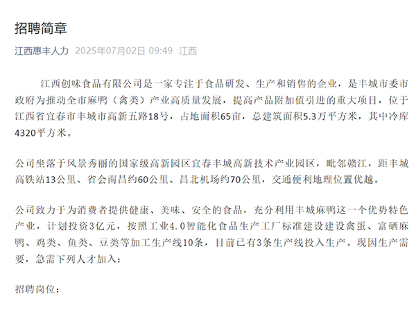 ->查看江西創(chuàng)味食品有限公司是一家專注于食品研發(fā)、生產(chǎn)和銷售的企業(yè),是豐城市委市政府為推動(dòng)全市麻鴨(禽類)產(chǎn)業(yè)高質(zhì)量發(fā)展,提高產(chǎn)品附加值引進(jìn)的重大項(xiàng)目,位于江西省宜春市豐城市高新五路18號(hào),占地面積65畝,總建筑面積5.3萬(wàn)平方米,其中冷庫(kù)4320平方米。公司坐落于風(fēng)...